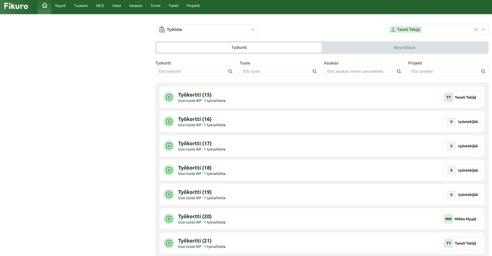 - Lisäsimme uuden "Työnohjaus"-valikon jonka alta löytyy tuttu "Työpisteet" -näkymä, sekä uusi "Omat työt" näkymä josta työntekijät löytävät heille osoitetut työt ja "Työlista" joka näyttää kaikki tuotannon työjonossa olevat työkortit. Työlistalla näkee myös työkortit myyntitilauksittain.