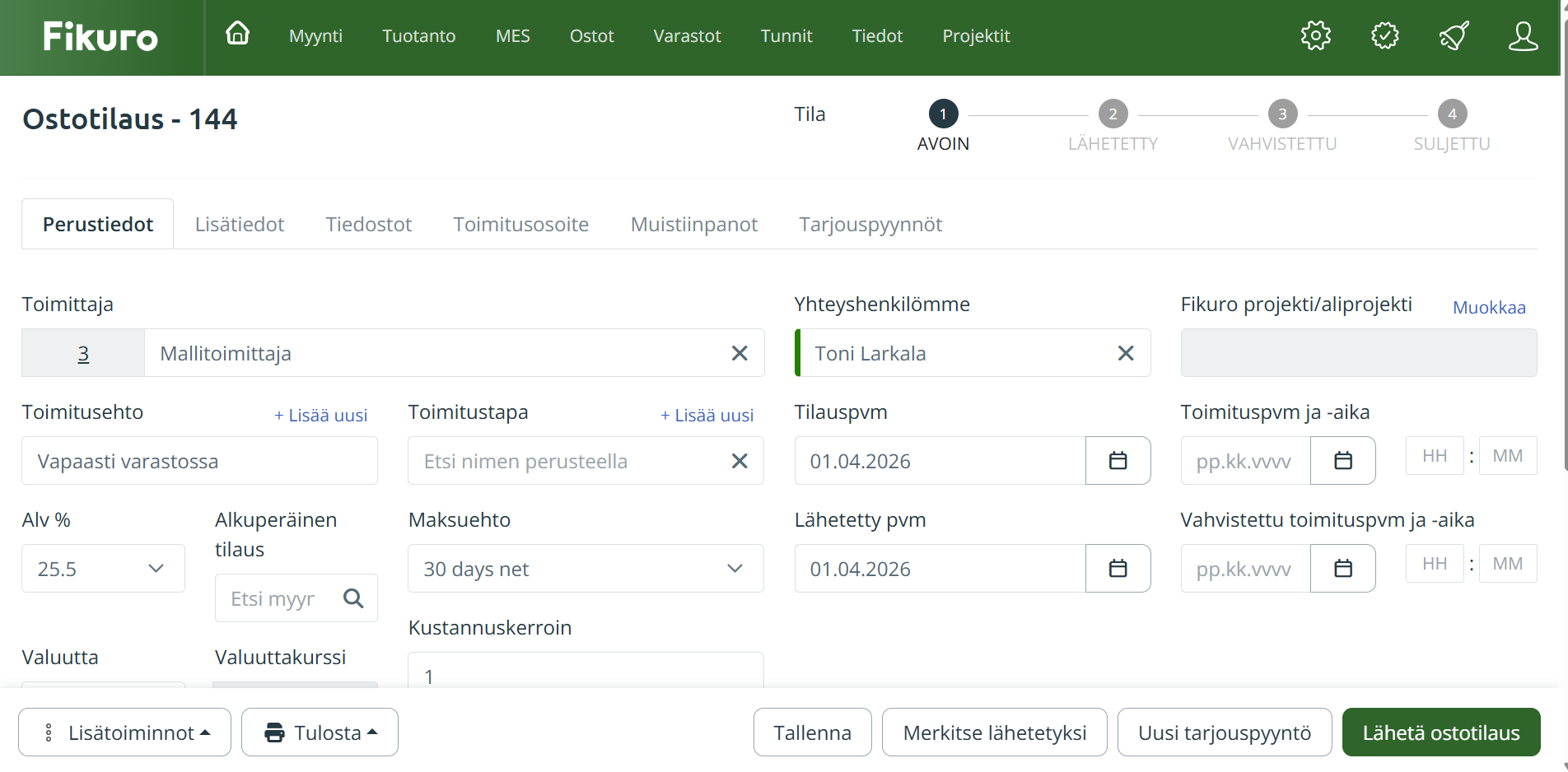 Olemme tuoneet myynnistä tutun, selkeän toimintopalkin nyt myös ostotilauksille ja laskuille. Jatkossa löydät tärkeimmät toiminnot (kuten tallennuksen, tulostuksen ja tilanvaihdon) aina samasta paikasta, tarkastelitpa sitten myyntiä, ostoja tai laskutusta. Tämä tekee järjestelmän käytöstä loogisempaa ja nopeampaa.